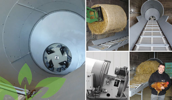 zur Zerkleinerung von Rundballen aus Stroh und anderer halmartiger Biomasse in Industrieausführung mit optionaler Steinabscheidung.