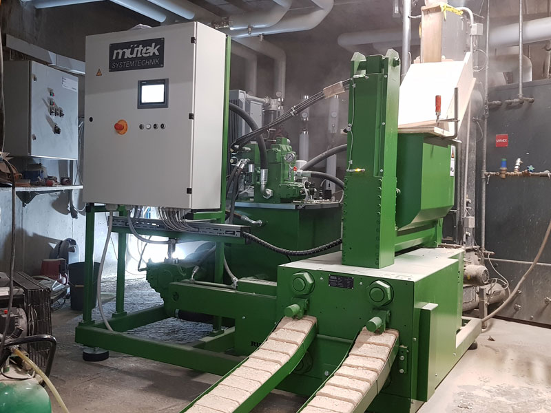 Die maximale Materialfeuchte des zu verarbeitenden Materials darf 14 % Atro nicht übersteigen. Der Pressvorgang erfolgt ohne Zusatz von Bindemittel allein durch den hydraulischen Pressdruck. Das Volumen des Ausgangsmaterials kann dabei materialabhängig um bis zu 90 % reduziert werden. Die Brikettierpressen sind entsprechend dem individuellen Kundenwunsch sowohl mit Silo, als auch zum Anbau an ein vorhandenes Silo lieferbar. Ebenfalls ist es möglich, die Maschine mit Spezialbehälter zum Unterbau unter eine bestehende Absaug- und Filteranlage als komplette Entsorgungseinheit auszustatten. Die Abmessungen eines Standard-Briketts beträgt 150 x 60 mm. Die Länge des Briketts ist von 40 - 105 mm über die Siemens SPS-Steuerung einstellbar. Durch die Regulierung der Brikettlänge wird das Brikettgewicht verändert. Die Einstellungen werden automatisch gespeichert. Über eine interne Logik ist gewährleistet, dass Briketts in gleichbleibender Qualität und Gewicht hergestellt werden können. Der Transport des Materials in das Silo der Presse kann mit einer Spänetransportschnecke, einem Förderband oder einem Ventilator erfolgen. Ein potentialfreier Kontakt für die Ansteuerung der Materialzufuhr ist in der Steuerung des Schaltschrankes der Presse integriert. Die Materialförderung wird über eine Lichtschranke überwacht. Ein vollautomatischer Betrieb ist dadurch möglich. Die Brikettierpresse für rechteckige Briketts kann mit einer Big-Bag-Befüllstation oder mit einem Verpackungstisch geliefert werden. Mit der Verpackungslade können Briketts zu Paketen mit je 10 kg in Plastikbeutel abgepackt und mit einer am Tisch angebrachten Schweißzange luftdicht verschlossen werden.